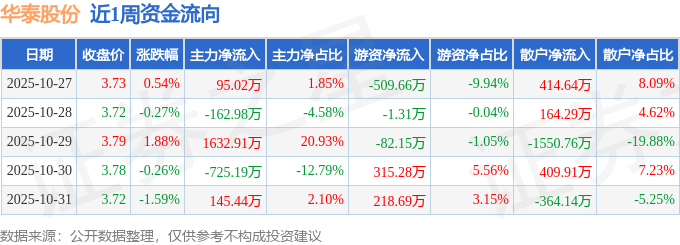资金流向数据方面,本周华泰股份主力资金合计净流入985.21万元,游资资金合计净流出59.15万元,散户资金合计净流出926.06万元。本周资金流向一览见下表: