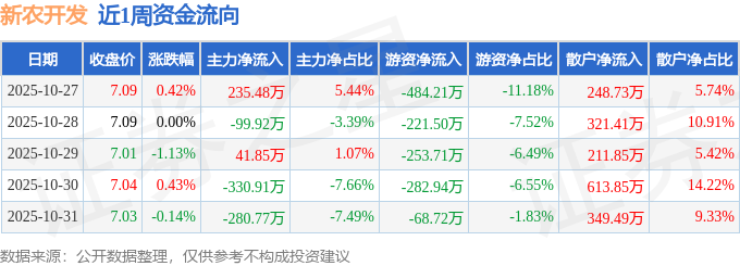 资金流向数据方面,本周新农开发主力资金合计净流出434.26万元,游资资金合计净流出1311.08万元,散户资金合计净流入1745.33万元。本周资金流向一览见下表: