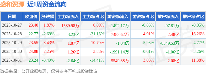 资金流向数据方面,本周盛和资源主力资金合计净流出2.57亿元,游资资金合计净流出827.75万元,散户资金合计净流入2.66亿元。本周资金流向一览见下表:
