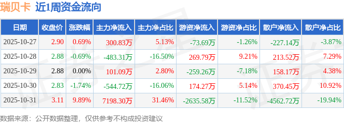 资金流向数据方面,本周瑞贝卡主力资金合计净流入6572.19万元,游资资金合计净流出2524.47万元,散户资金合计净流出4047.72万元。本周资金流向一览见下表: