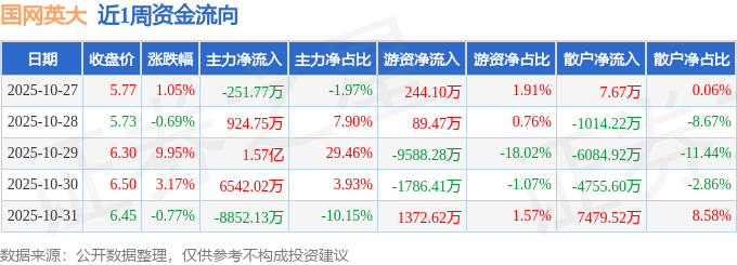 资金流向数据方面,本周国网英大主力资金合计净流入1.4亿元,游资资金合计净流出9668.51万元,散户资金合计净流出4367.56万元。本周资金流向一览见下表: