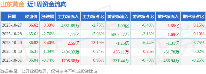 资金流向数据方面,本周山东黄金主力资金合计净流入1.12亿元,游资资金合计净流出3.0亿元,散户资金合计净流入1.89亿元。本周资金流向一览见下表: