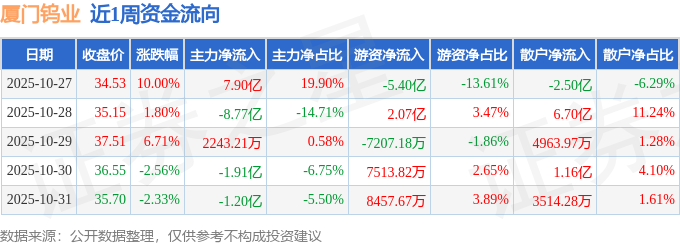 资金流向数据方面,本周厦门钨业主力资金合计净流出3.76亿元,游资资金合计净流出2.45亿元,散户资金合计净流入6.21亿元。本周资金流向一览见下表: