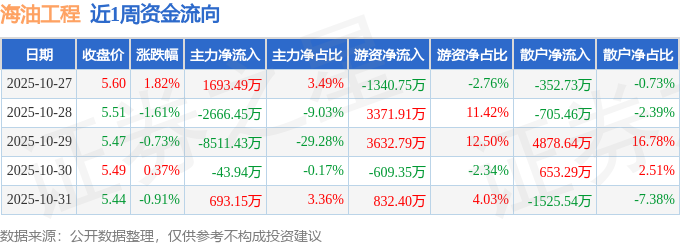 资金流向数据方面,本周海油工程主力资金合计净流出8835.2万元,游资资金合计净流入5887.0万元,散户资金合计净流入2948.2万元。本周资金流向一览见下表: