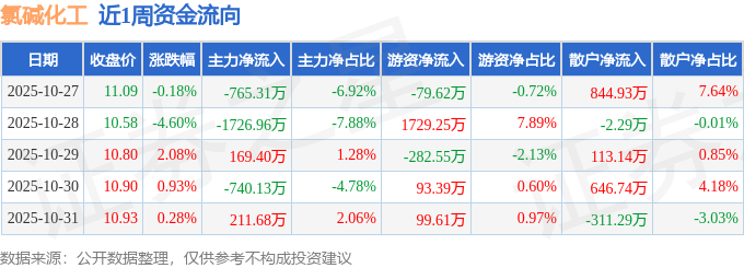 资金流向数据方面,本周氯碱化工主力资金合计净流出2851.31万元,游资资金合计净流入1560.08万元,散户资金合计净流入1291.23万元。本周资金流向一览见下表: