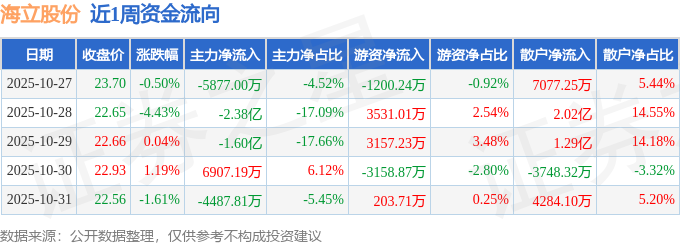 资金流向数据方面,本周海立股份主力资金合计净流出4.32亿元,游资资金合计净流入2532.84万元,散户资金合计净流入4.07亿元。本周资金流向一览见下表:
