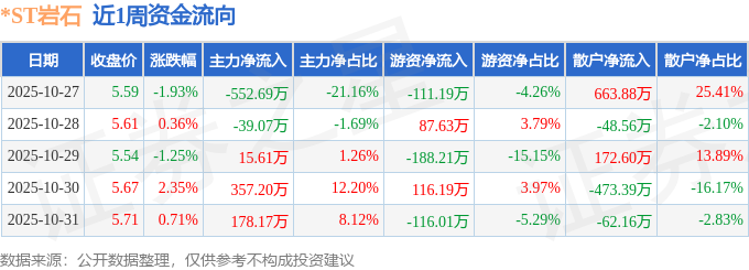 沪深股通持股方面,截止2025年10月31日收盘,*ST岩石沪股通持股数为204.17万股,占流通股比为61.0%。