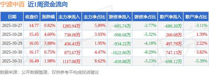 资金流向数据方面,本周宁波中百主力资金合计净流入4453.04万元,游资资金合计净流出4580.32万元,散户资金合计净流入127.28万元。本周资金流向一览见下表: