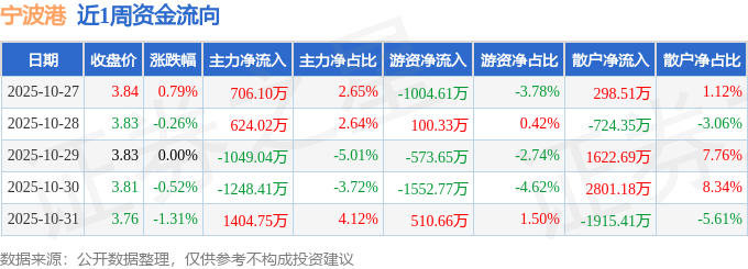资金流向数据方面,本周宁波港主力资金合计净流入437.41万元,游资资金合计净流出2520.04万元,散户资金合计净流入2082.63万元。本周资金流向一览见下表: