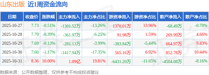 资金流向数据方面,本周山东出版主力资金合计净流入7572.72万元,游资资金合计净流出4787.89万元,散户资金合计净流出2784.83万元。本周资金流向一览见下表: