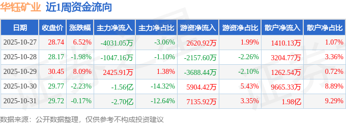 资金流向数据方面,本周华钰矿业主力资金合计净流出4.52亿元,游资资金合计净流入9815.22万元,散户资金合计净流入3.54亿元。本周资金流向一览见下表: