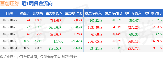 资金流向数据方面,本周首创证券主力资金合计净流出1.78亿元,游资资金合计净流入3530.7万元,散户资金合计净流入1.42亿元。本周资金流向一览见下表: