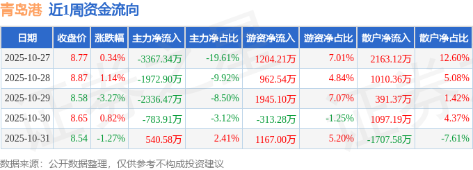 资金流向数据方面,本周青岛港主力资金合计净流出7920.04万元,游资资金合计净流入4965.57万元,散户资金合计净流入2954.47万元。本周资金流向一览见下表:
