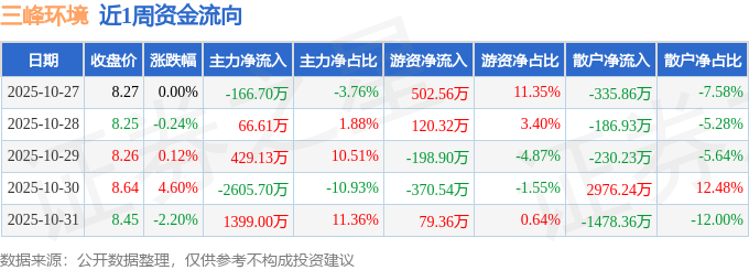 资金流向数据方面,本周三峰环境主力资金合计净流出877.66万元,游资资金合计净流入132.8万元,散户资金合计净流入744.86万元。本周资金流向一览见下表: