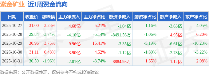 资金流向数据方面,本周紫金矿业主力资金合计净流入12.43亿元,游资资金合计净流出5.48亿元,散户资金合计净流出6.95亿元。本周资金流向一览见下表: