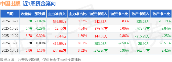 资金流向数据方面,本周中国出版主力资金合计净流入1926.55万元,游资资金合计净流出300.72万元,散户资金合计净流出1625.83万元。本周资金流向一览见下表: