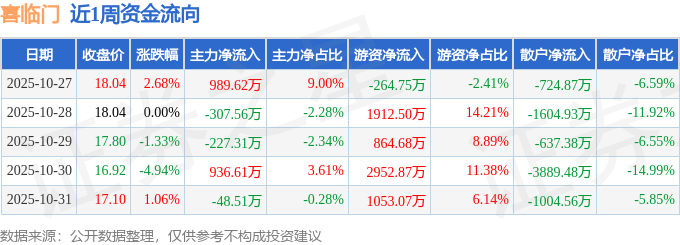 资金流向数据方面,本周喜临门主力资金合计净流入1342.85万元,游资资金合计净流入6518.37万元,散户资金合计净流出7861.21万元。本周资金流向一览见下表: