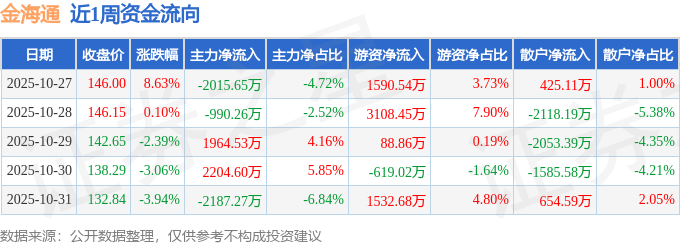 资金流向数据方面,本周金海通主力资金合计净流出1024.05万元,游资资金合计净流入5701.51万元,散户资金合计净流出4677.46万元。本周资金流向一览见下表: