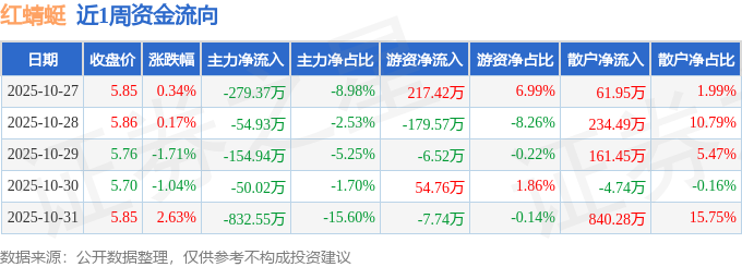 资金流向数据方面,本周红蜻蜓主力资金合计净流出1371.8万元,游资资金合计净流入78.36万元,散户资金合计净流入1293.44万元。本周资金流向一览见下表: