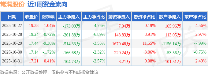 资金流向数据方面,本周常润股份主力资金合计净流出1220.62万元,游资资金合计净流入2049.8万元,散户资金合计净流出829.18万元。本周资金流向一览见下表: