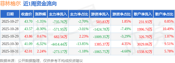 资金流向数据方面,本周菲林格尔主力资金合计净流出5312.76万元,游资资金合计净流出1610.68万元,散户资金合计净流入6923.44万元。本周资金流向一览见下表: