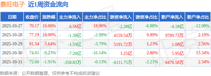资金流向数据方面,本周景旺电子主力资金合计净流出3.66亿元,游资资金合计净流出8089.46万元,散户资金合计净流入4.47亿元。本周资金流向一览见下表: