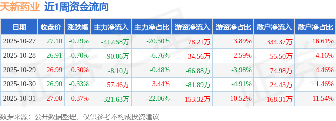 资金流向数据方面,本周天新药业主力资金合计净流出774.91万元,游资资金合计净流入117.31万元,散户资金合计净流入657.6万元。本周资金流向一览见下表: