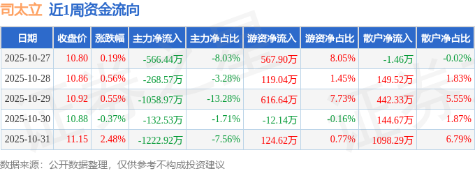 资金流向数据方面,本周司太立主力资金合计净流出3249.43万元,游资资金合计净流入1416.06万元,散户资金合计净流入1833.37万元。本周资金流向一览见下表: