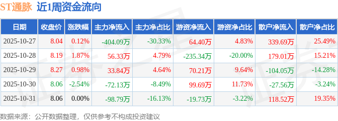 资金流向数据方面,本周ST通脉主力资金合计净流出484.84万元,游资资金合计净流出20.77万元,散户资金合计净流入505.61万元。本周资金流向一览见下表: