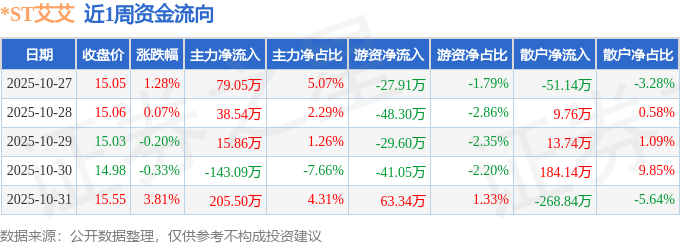 资金流向数据方面,本周*ST艾艾主力资金合计净流入195.85万元,游资资金合计净流出83.52万元,散户资金合计净流出112.34万元。本周资金流向一览见下表: