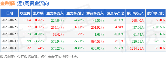 资金流向数据方面,本周金麒麟主力资金合计净流出1056.48万元,游资资金合计净流入413.25万元,散户资金合计净流入643.23万元。本周资金流向一览见下表: