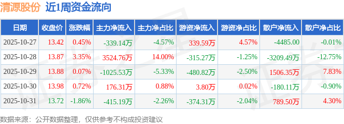 资金流向数据方面,本周清源股份主力资金合计净流入1921.22万元,游资资金合计净流出827.01万元,散户资金合计净流出1094.21万元。本周资金流向一览见下表: