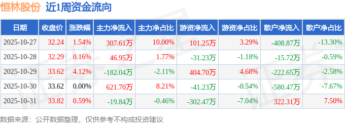 资金流向数据方面,本周恒林股份主力资金合计净流入774.37万元,游资资金合计净流入131.03万元,散户资金合计净流出905.4万元。本周资金流向一览见下表: