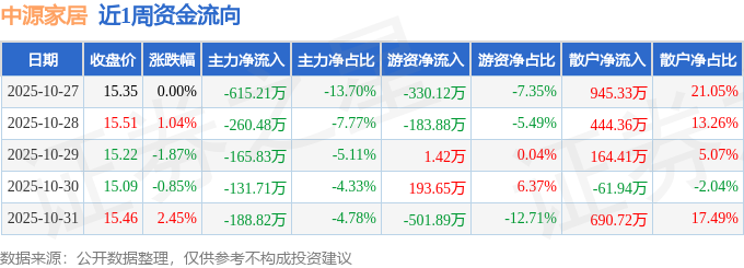 资金流向数据方面,本周中源家居主力资金合计净流出1362.05万元,游资资金合计净流出820.82万元,散户资金合计净流入2182.88万元。本周资金流向一览见下表: