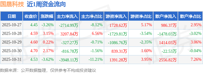 资金流向数据方面,本周国晟科技主力资金合计净流出4599.3万元,游资资金合计净流入1142.64万元,散户资金合计净流入3456.66万元。本周资金流向一览见下表: