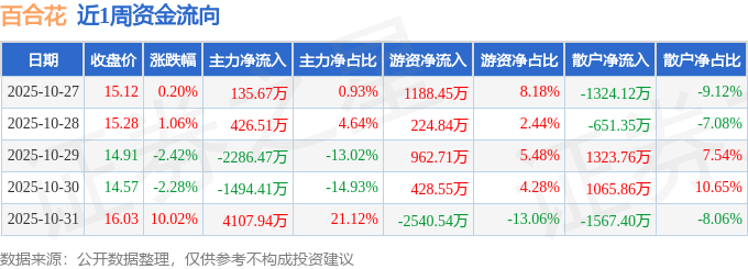 资金流向数据方面,本周百合花主力资金合计净流入889.24万元,游资资金合计净流入264.0万元,散户资金合计净流出1153.24万元。本周资金流向一览见下表: