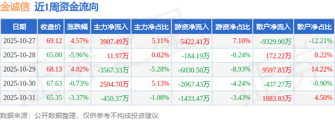 资金流向数据方面,本周金诚信主力资金合计净流入2406.47万元,游资资金合计净流出4293.17万元,散户资金合计净流入1886.7万元。本周资金流向一览见下表: