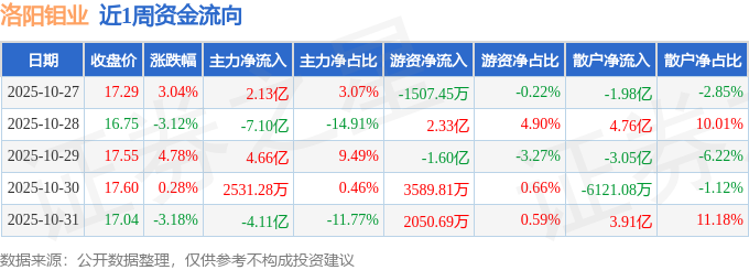 资金流向数据方面,本周洛阳钼业主力资金合计净流出4.17亿元,游资资金合计净流入1.14亿元,散户资金合计净流入3.03亿元。本周资金流向一览见下表: