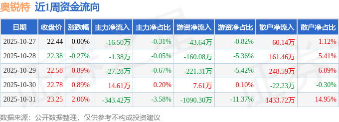 资金流向数据方面,本周奥锐特主力资金合计净流出373.96万元,游资资金合计净流出1507.72万元,散户资金合计净流入1881.68万元。本周资金流向一览见下表: