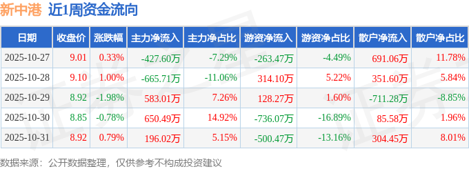 资金流向数据方面,本周新中港主力资金合计净流入336.22万元,游资资金合计净流出1057.64万元,散户资金合计净流入721.42万元。本周资金流向一览见下表: