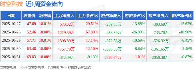 资金流向数据方面,本周时空科技主力资金合计净流入7637.31万元,游资资金合计净流出2659.58万元,散户资金合计净流出4977.73万元。本周资金流向一览见下表: