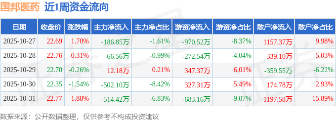 资金流向数据方面,本周国邦医药主力资金合计净流出1257.75万元,游资资金合计净流出1251.55万元,散户资金合计净流入2509.3万元。本周资金流向一览见下表: