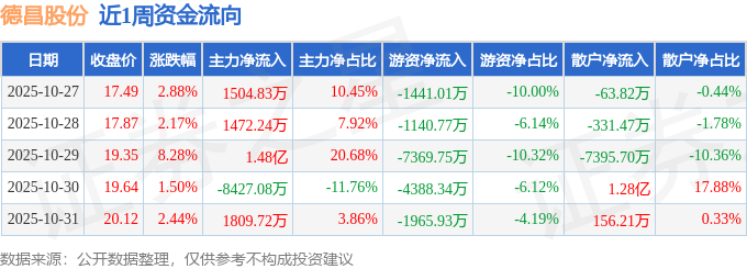 资金流向数据方面,本周德昌股份主力资金合计净流入1.11亿元,游资资金合计净流出1.63亿元,散户资金合计净流入5180.63万元。本周资金流向一览见下表: