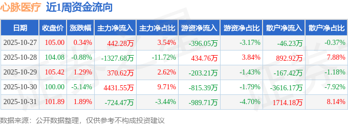 资金流向数据方面,本周心脉医疗主力资金合计净流入3192.31万元,游资资金合计净流出1969.59万元,散户资金合计净流出1222.72万元。本周资金流向一览见下表: