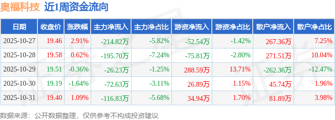 资金流向数据方面,本周奥福科技主力资金合计净流出626.21万元,游资资金合计净流入222.07万元,散户资金合计净流入404.13万元。本周资金流向一览见下表: