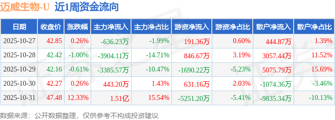 资金流向数据方面,本周迈威生物主力资金合计净流入7603.83万元,游资资金合计净流出5272.24万元,散户资金合计净流出2331.6万元。本周资金流向一览见下表:
