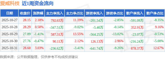 资金流向数据方面,本周爱威科技主力资金合计净流入885.92万元,游资资金合计净流出1286.79万元,散户资金合计净流入400.88万元。本周资金流向一览见下表: