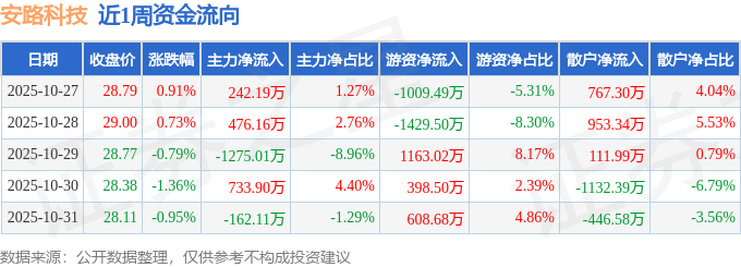 资金流向数据方面,本周安路科技主力资金合计净流入15.13万元,游资资金合计净流出268.79万元,散户资金合计净流入253.65万元。本周资金流向一览见下表:
