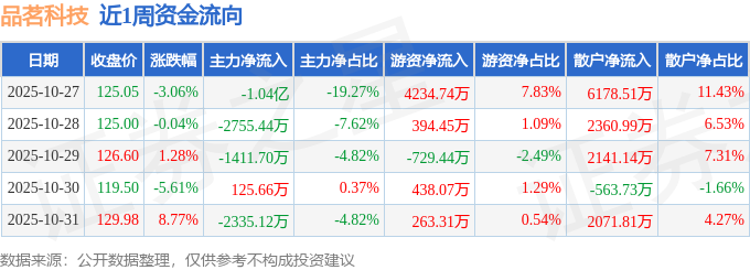资金流向数据方面,本周品茗科技主力资金合计净流出1.68亿元,游资资金合计净流入4601.12万元,散户资金合计净流入1.22亿元。本周资金流向一览见下表: