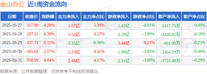资金流向数据方面,本周金山办公主力资金合计净流入6.45亿元,游资资金合计净流出5.57亿元,散户资金合计净流出8793.25万元。本周资金流向一览见下表: